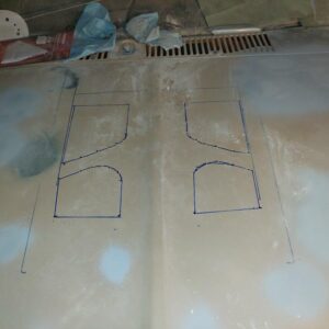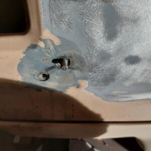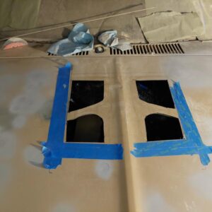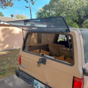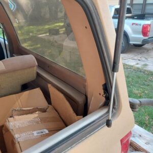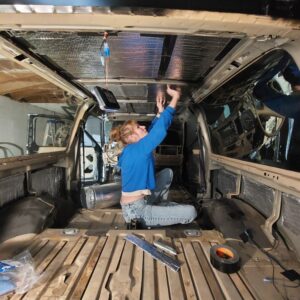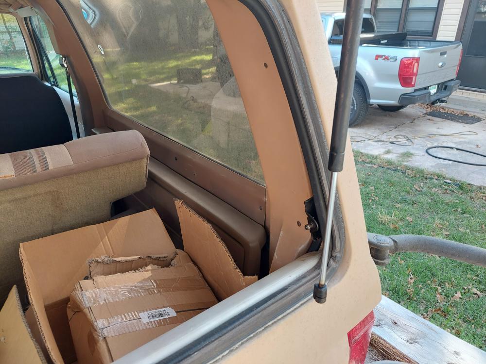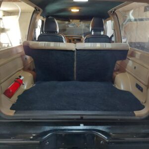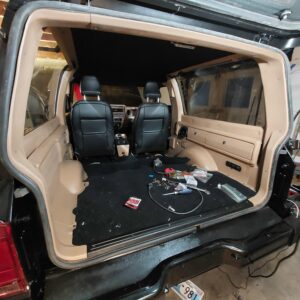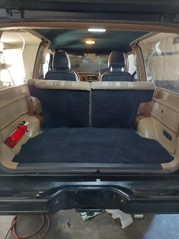 Laura installed insulation inside of the vehicle before we installed the headliner that she recovered. All of the interior pieces were repainted with Rust-Oleum Painters Touch Satin Nutmeg. The old carpet was replaced with a new black one, and the carpet on the rear of the back seats were painted with Dupli-Color vinyl and Fabric Coating to match.