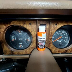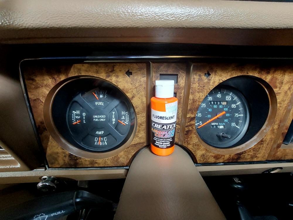The needles on the dash gauges had faded white so I repainted them using Orange Createx Fluorescent Airbrush paint and a small paint brush.