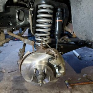 The suspension was updated with Rough Country 1.5-Inch lift coils in the front with Skyjacker BlackMax shocks. The rear received a Skyjacker Add-A-Leaf and a set of Skyjacker BlackMax Shocks. A set of Mile Marker 427 manual locking hubs replaced the factory automatic locking hubs. The automatics hubs were swapped to the manual hubs using a Mile Marker 95-27988 Hub Conversion Kit Automatic To Manual Hub Conversion Kit.