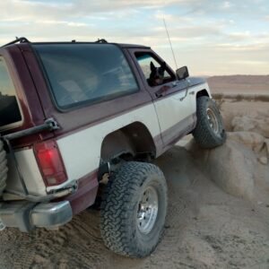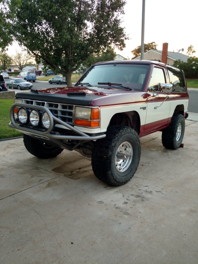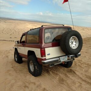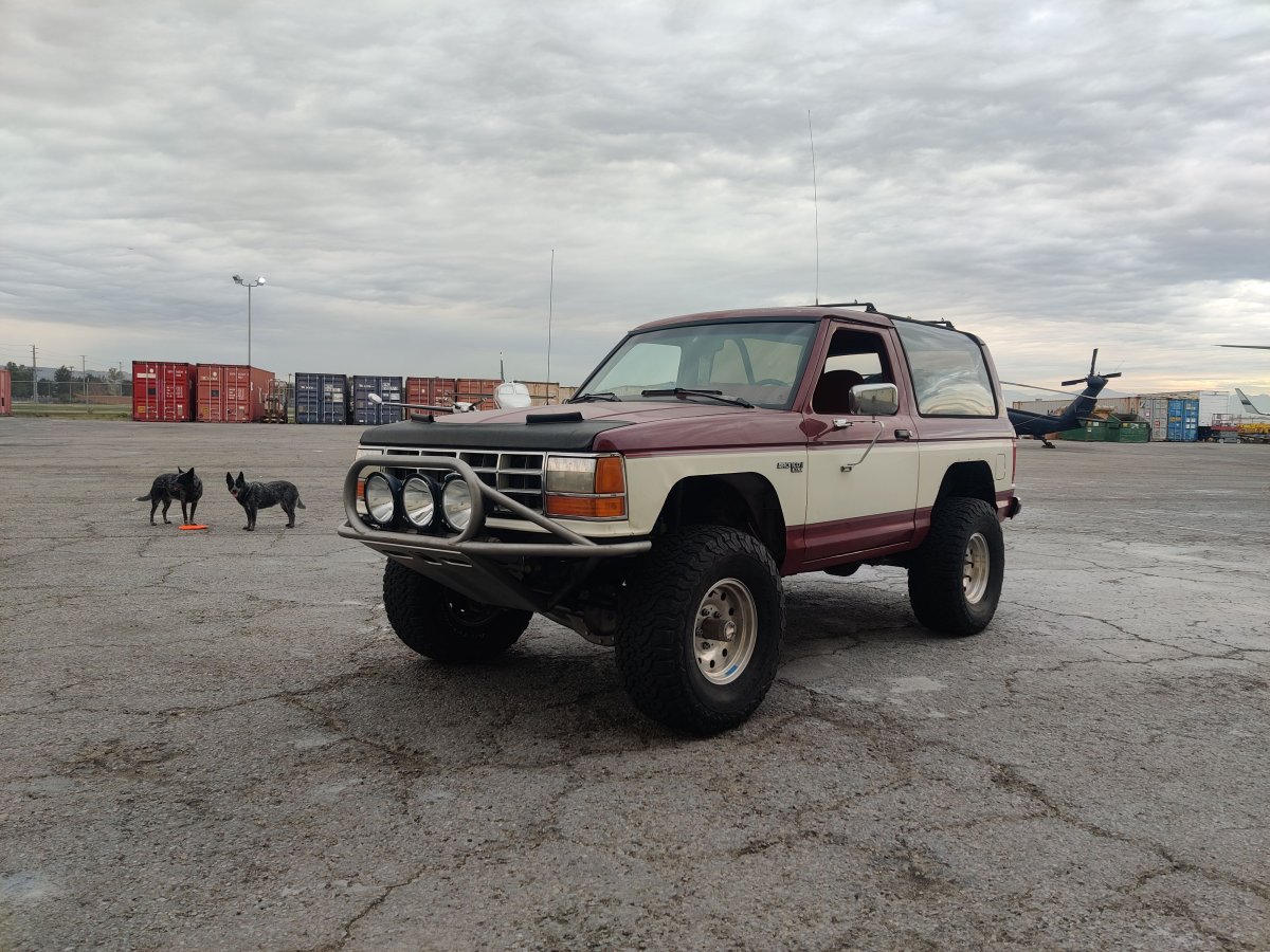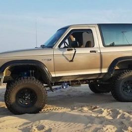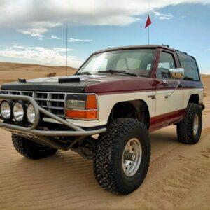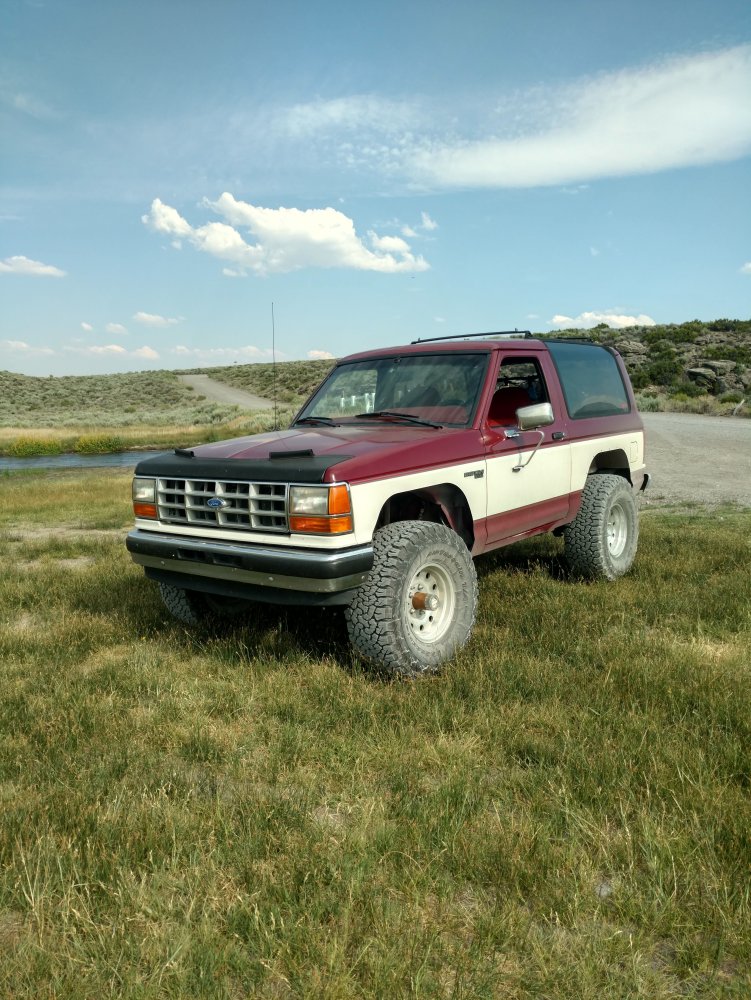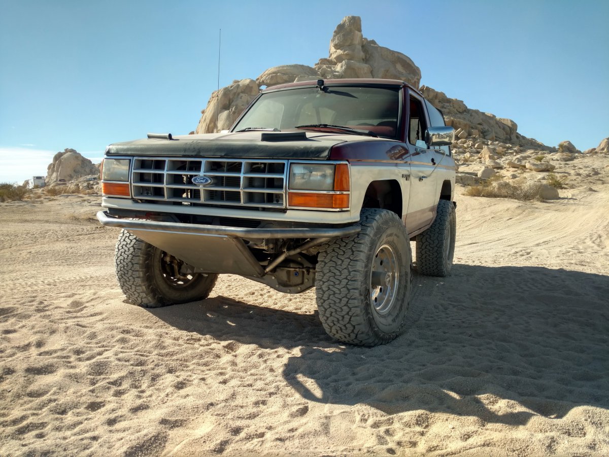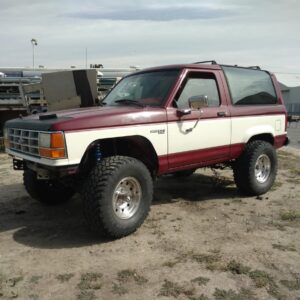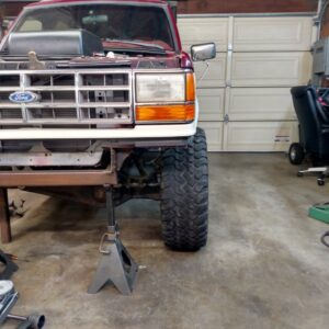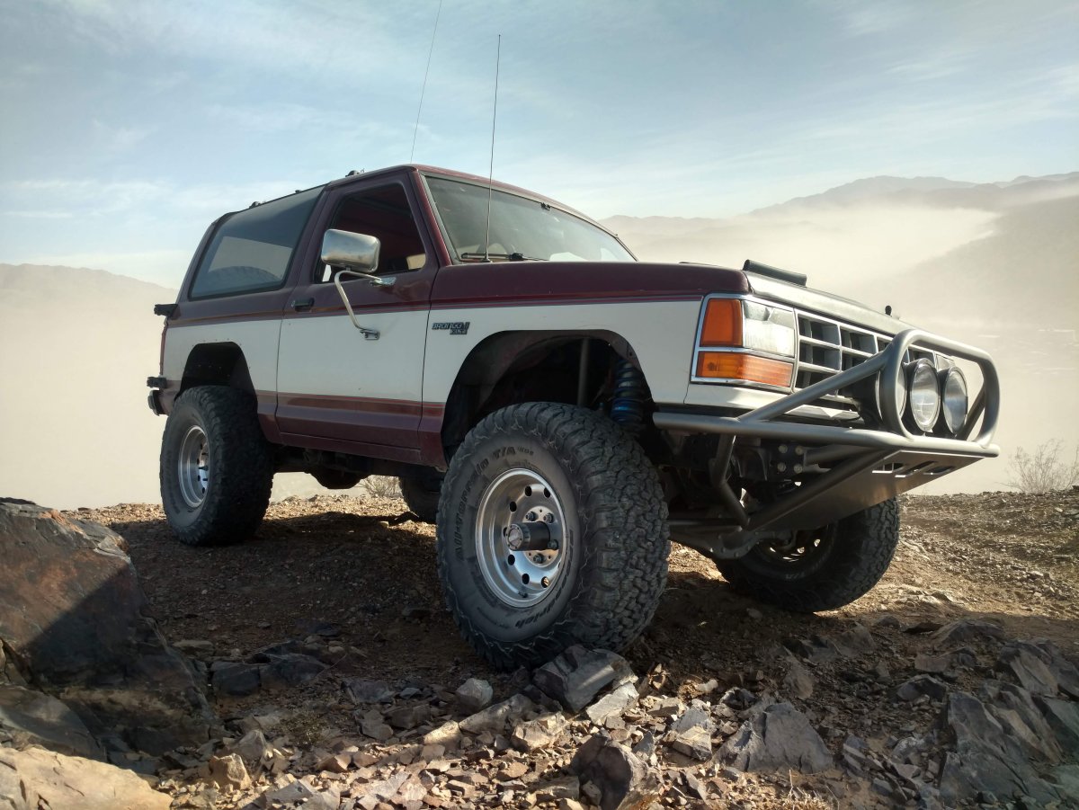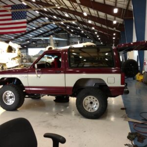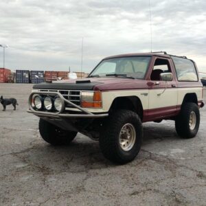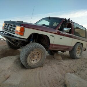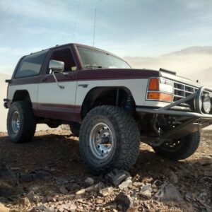 After purchasing the Bronco II the stock 140 horsepower 2.9L engine was replaced with a stock 160 horsepower 4.0L OHV engine, and then later upgraded to 207 horsepower 4.0L SOHC engine. The stock Dana 28 TTB front axle assembly was replaced with a larger Dana 35 TTB assembly that has been upgraded with Dana 44 steering knuckles and manual locking hubs.