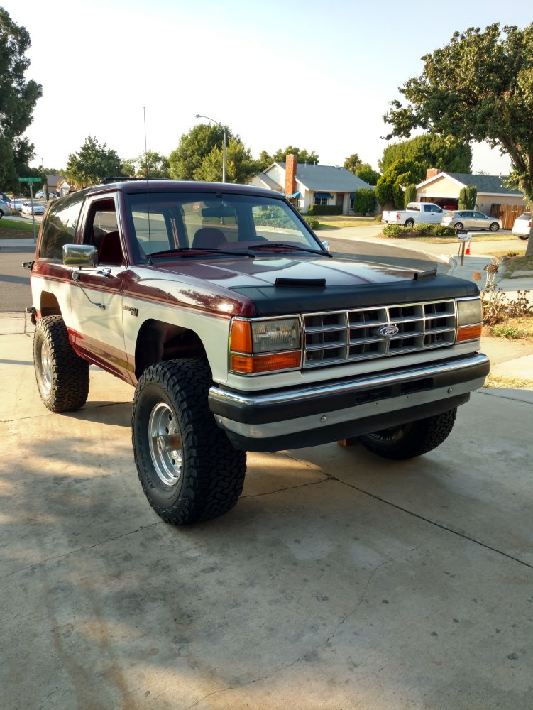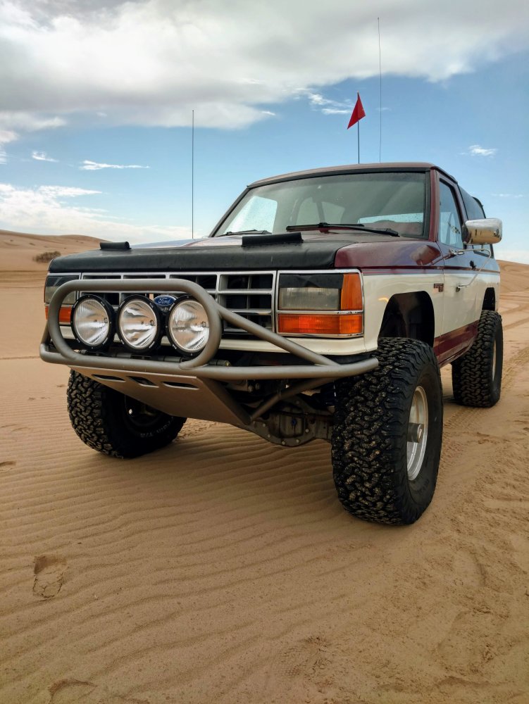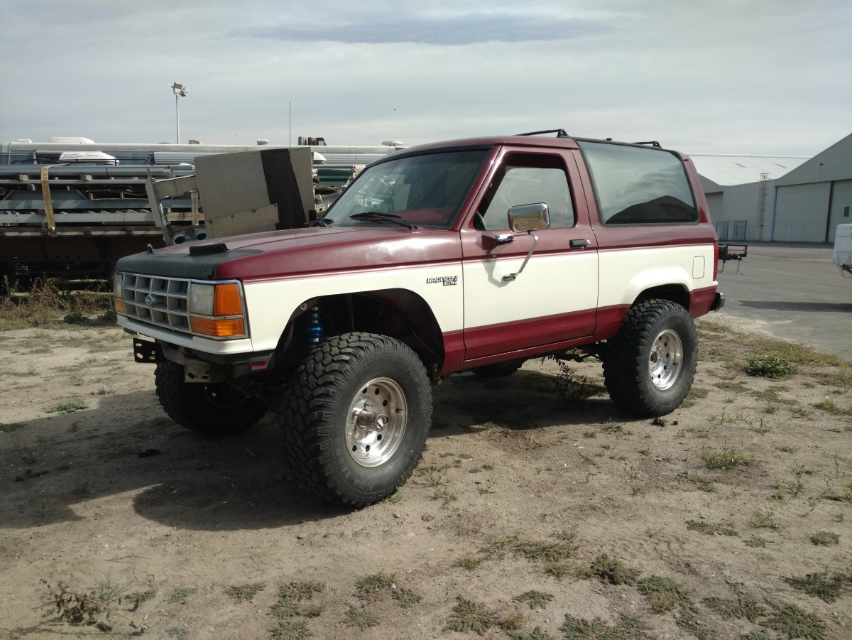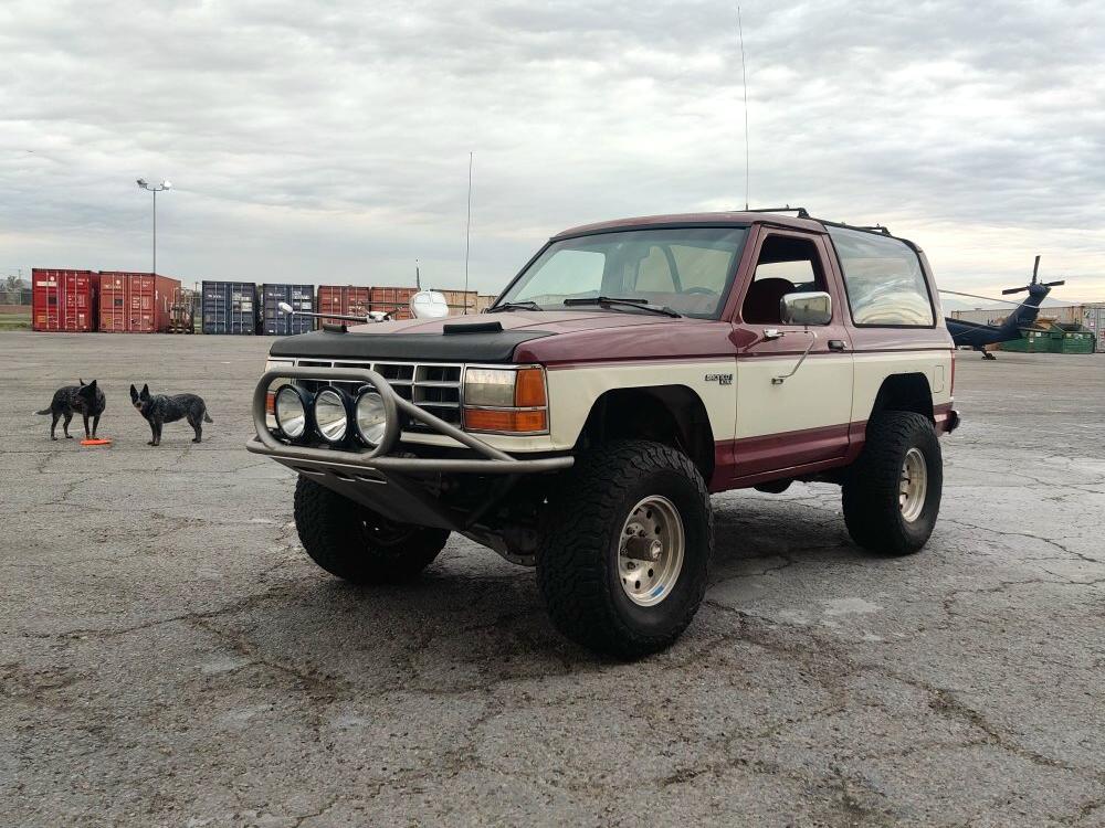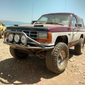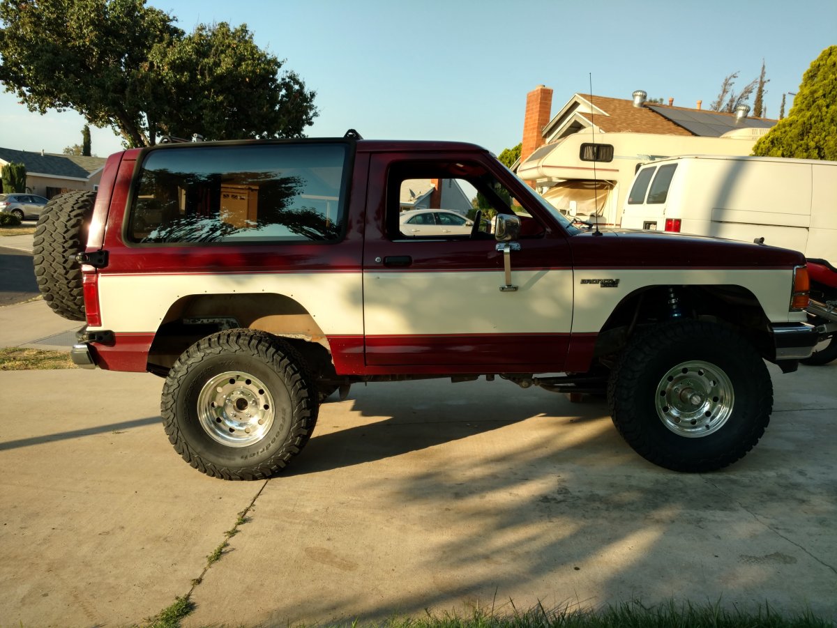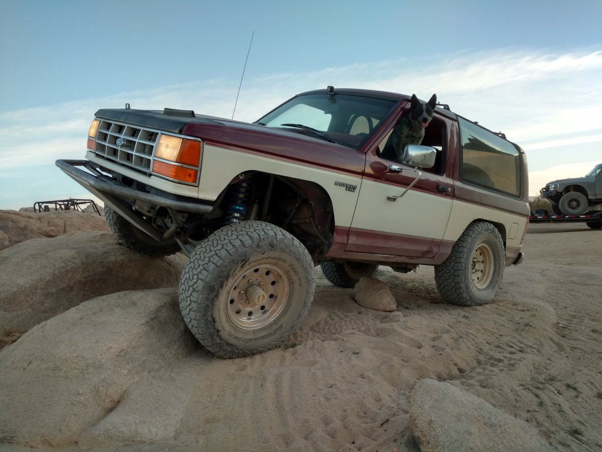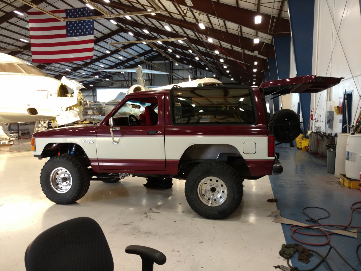 After purchasing the Bronco II the stock 140 horsepower 2.9L engine was replaced with a stock 160 horsepower 4.0L OHV engine, and then later upgraded to 207 horsepower 4.0L SOHC engine. The stock Dana 28 TTB front axle assembly was replaced with a larger Dana 35 TTB assembly that has been upgraded with Dana 44 steering knuckles and manual locking hubs.