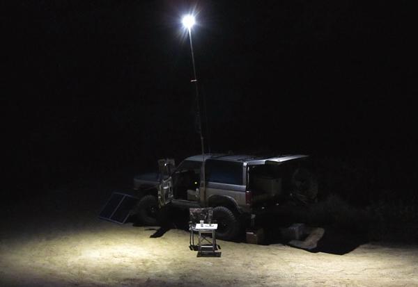 A lightweight 16-foot sectional mast is available for mounting the LED floodlights for overhead campsite lighting, which can be mounted to an object 1-2 inches thick (a square-tube vehicle bumper or rockslider, certain wooden picnic tables, etc.)