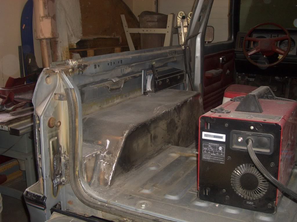 4xranger started by cutting off the top, gutting the interior, and then lifting the body off of the frame. The chassis was rolled out and cleaned up with a grinder and wire wheel. The chassis was then rolled back under the body, and a body lift was made from 2-inch pipe and steel plate.