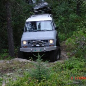He installed a 4.0L V6 out of a 1991 Ford Ranger that uses 95TM ported heads, modified throttle body, modified headers, Electric fan, 130 Amp alternator, and dual batteries. The Ranger also donated a M5OD-R1 5-speed manual transmission and BW1354 manual transfer case.