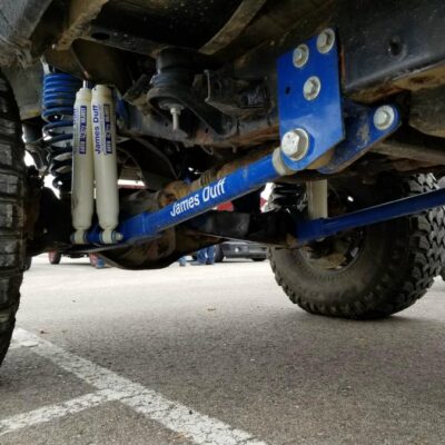 The suspension is a James Duff Stage 3 5.5-inch suspension lift with dual shocks and extended radius arms. Dan was lucky enough to purchase a Bronco II that already came with the stronger Dana 35 front axle. He added 4.88 gears and swapped in Dana 44 knuckles from a Full size 1995 Ford Bronco. This gave him larger bearings, a wider wheel bearing space, better brakes, and the stronger full size locking hubs.