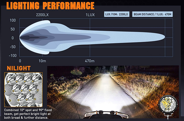 Back in the days of halogen lights, off roaders use to like to combine a KC spot ad a KC flood to see far and wide. With today’s LED technology, you can buy off-road lights that are a spot/flood combination. In the image below, you can see how this LED light with a 10° spot and 90° flood beam projects light down the road as well as off to the side.