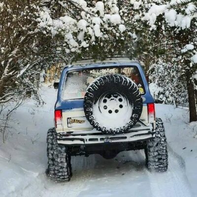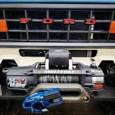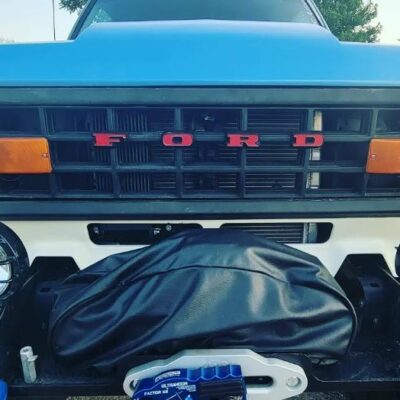 The front of the Bronco II received a custom front winch bumper, a Smiitybilt X20 10,000 lb winch, and LED lights. The square headlights were replaced with round LED headlights. The round headlights, turn signals added to the grill, and FORD letters give the Bronco II the look and feel of and early first-generation Ford Bronco.