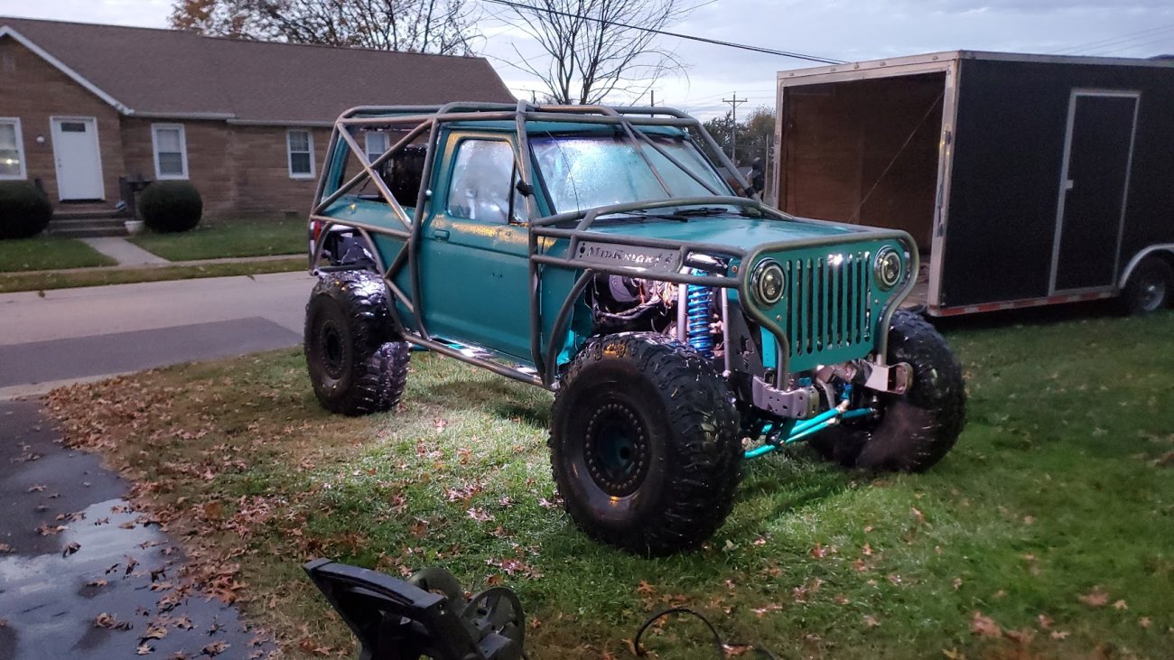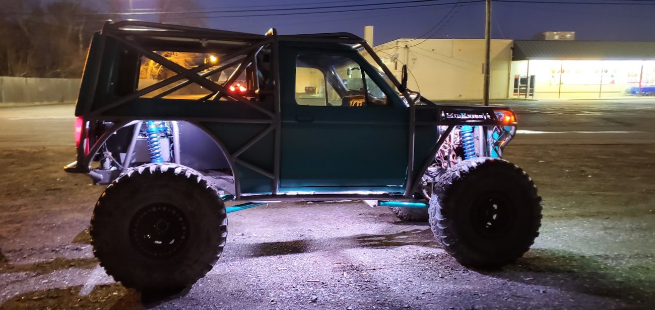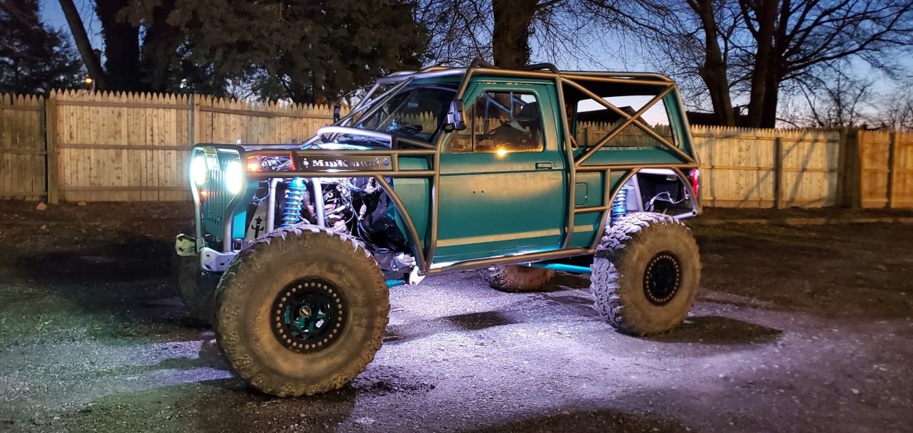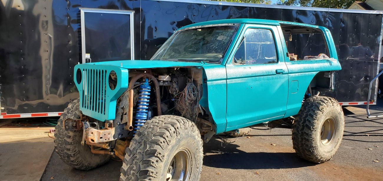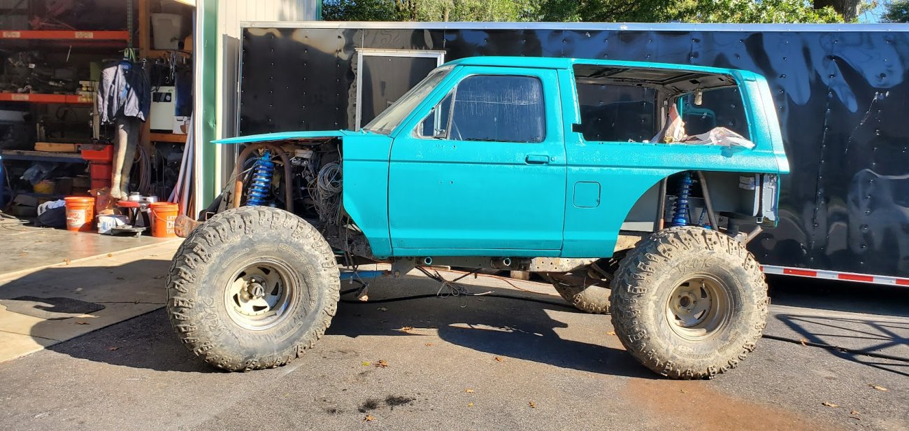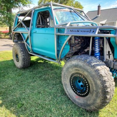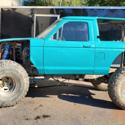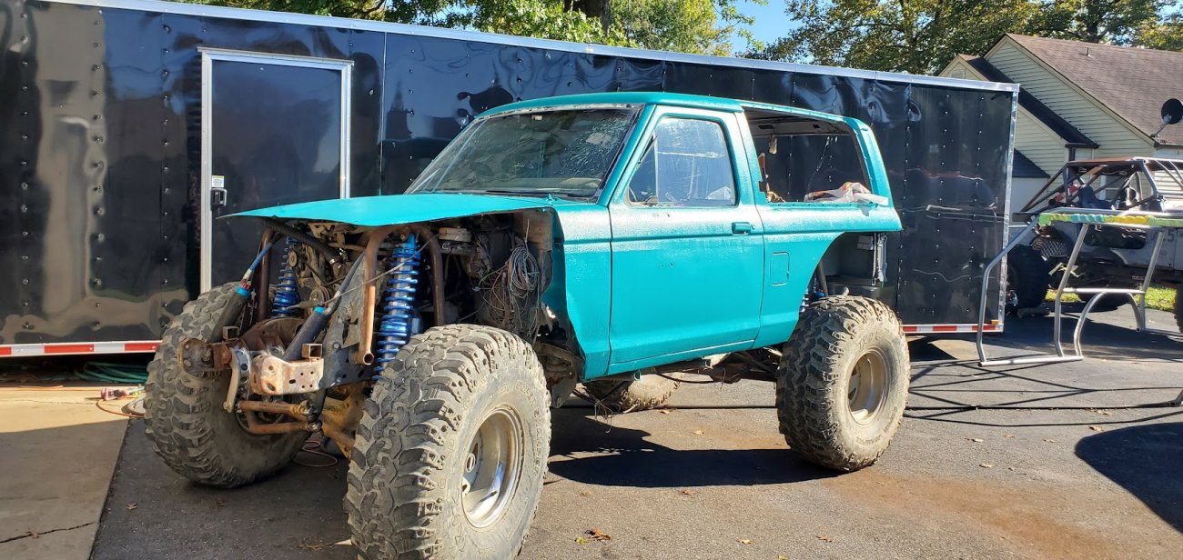Dugan of MidKnight Fabrications had a modified Ford Ranger, but the body was trashed from a few rollovers and tree encounters. He found an old Bronco II and decided to transfer all of the good parts from the Ranger to the Bronco II.