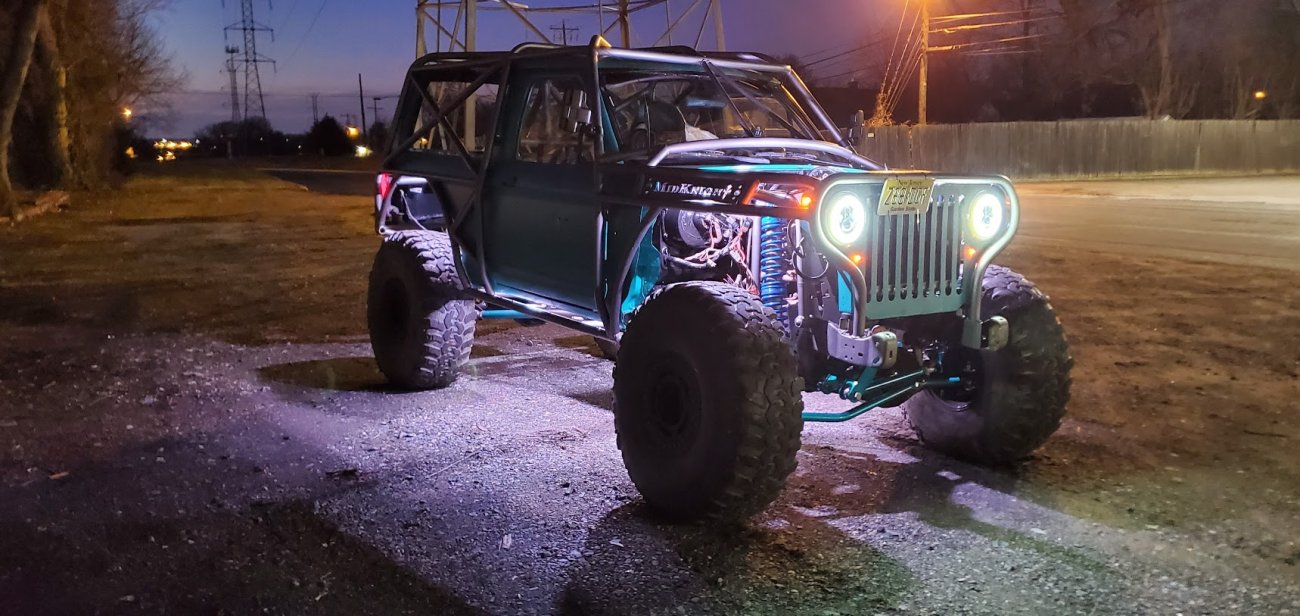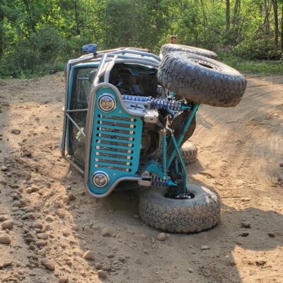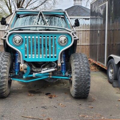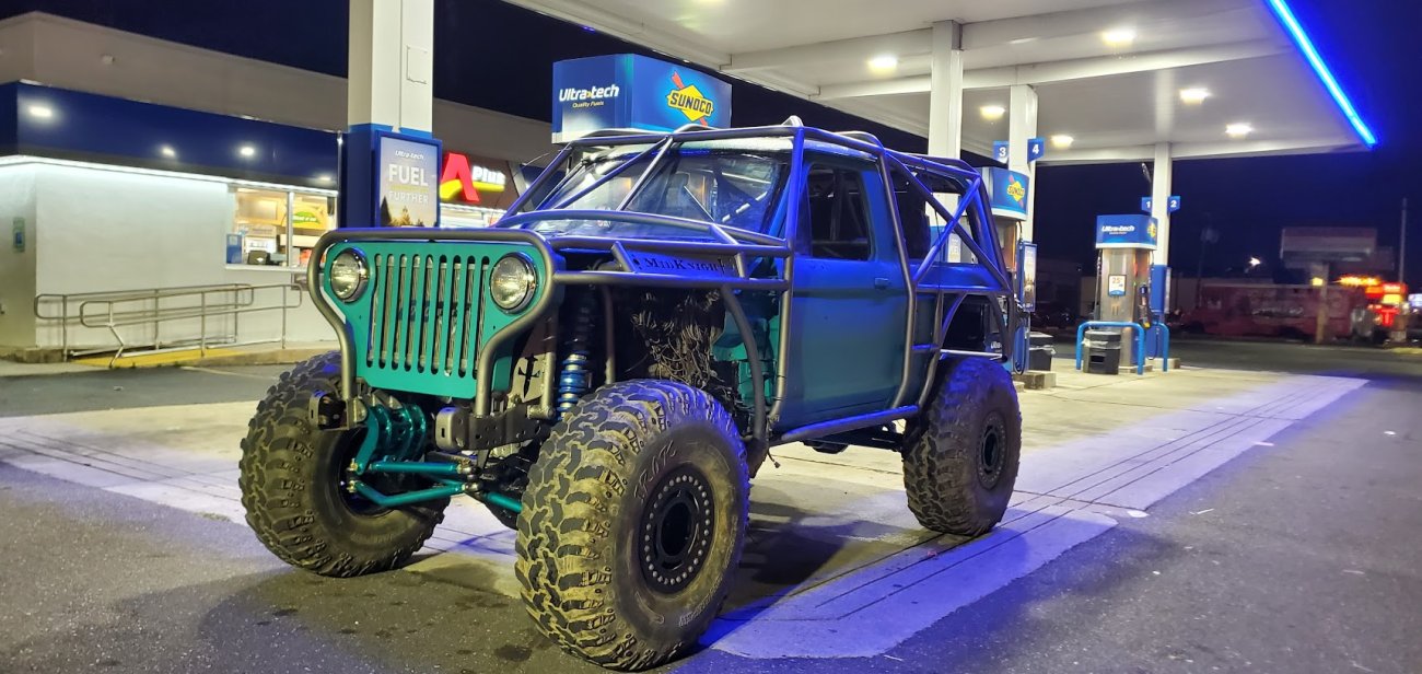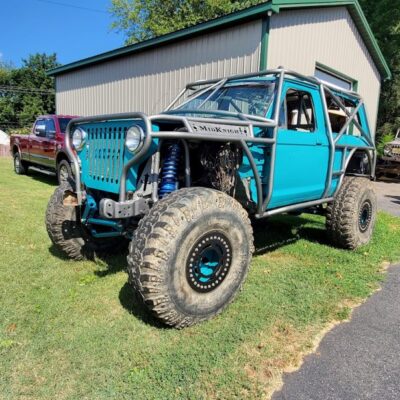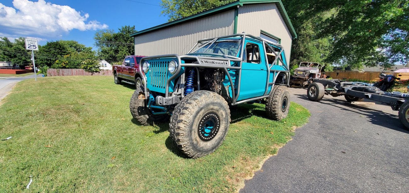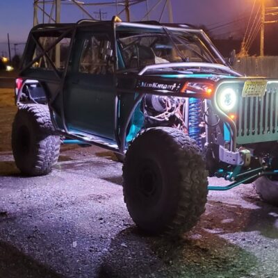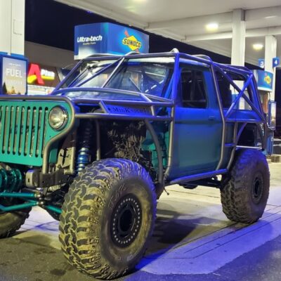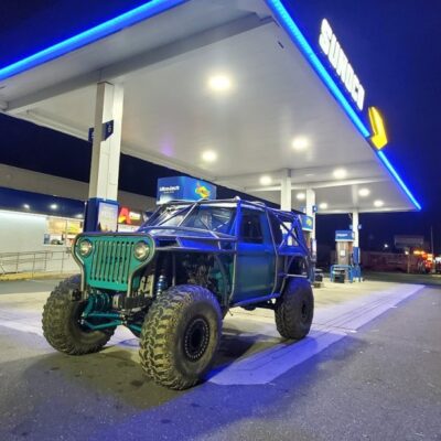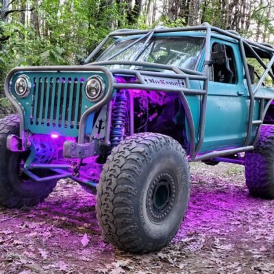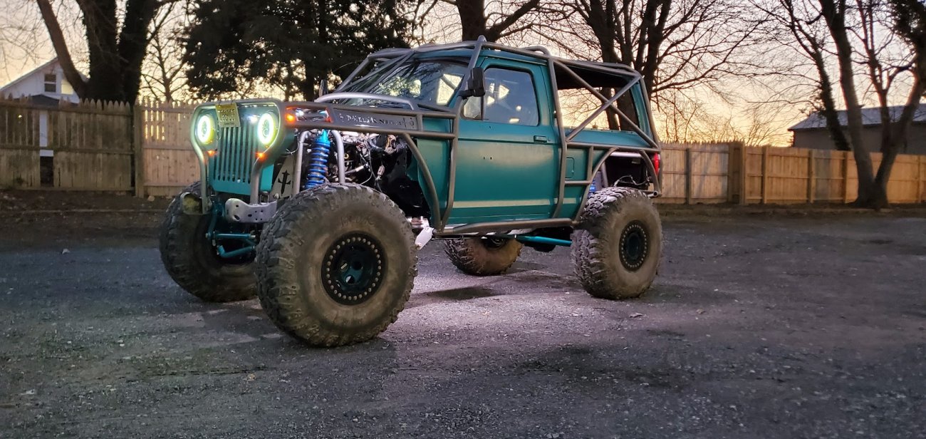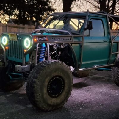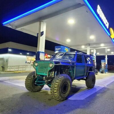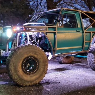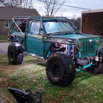 Here’s something you’ve probably never seen before. It looks like some kind of Willys coming towards you, but it’s a little confusing because you’re counting the grill slots, but there aren’t any turn signals under the headlights, or the holes to mount them in. Looking closer it appears to have a Ford TTB front suspension. Is that a Dana 44 TTB? Those look like 39-inch IROKS that you would find on a rock crawler. Why doesn’t this thing have a Dana 60 solid front axle?