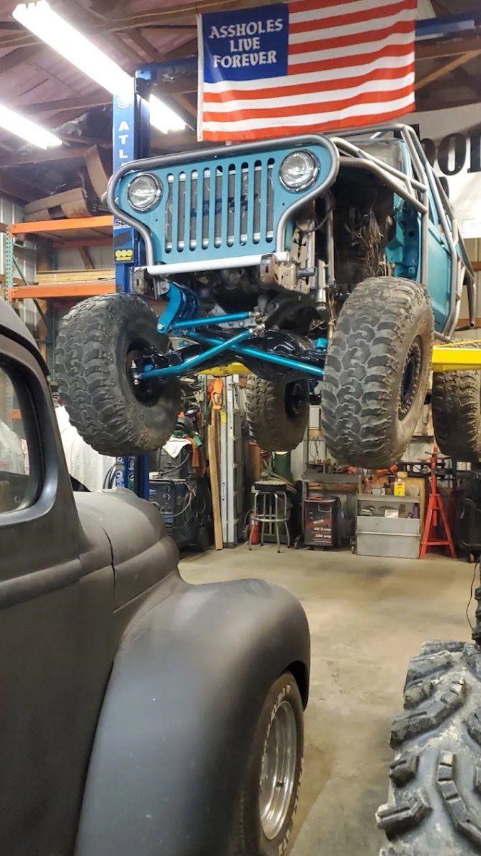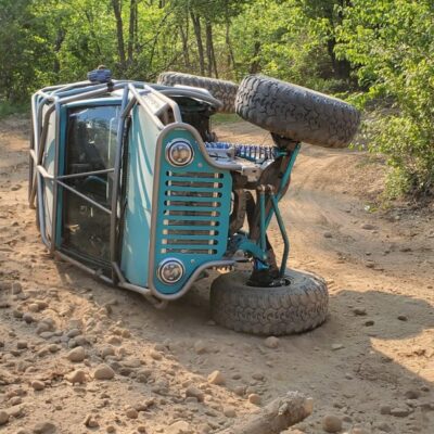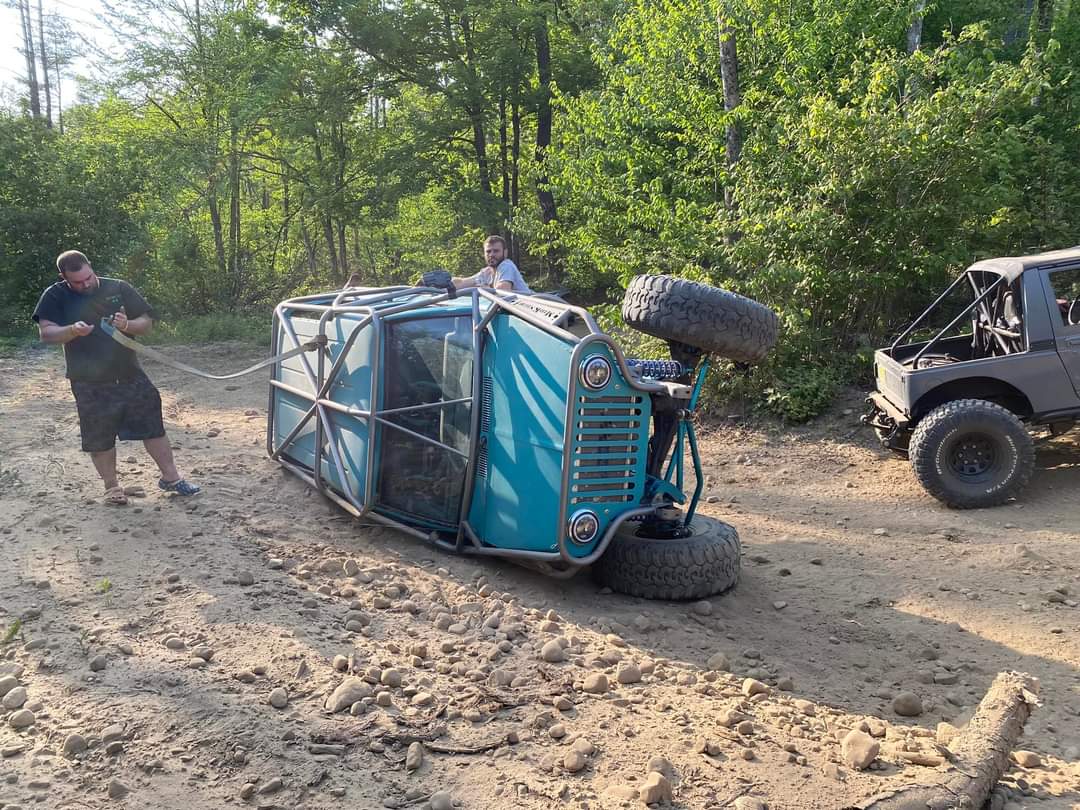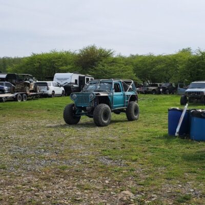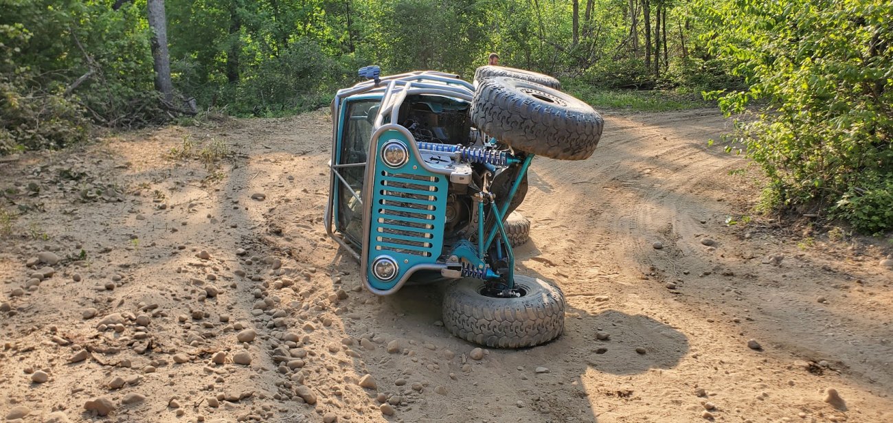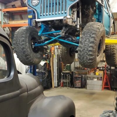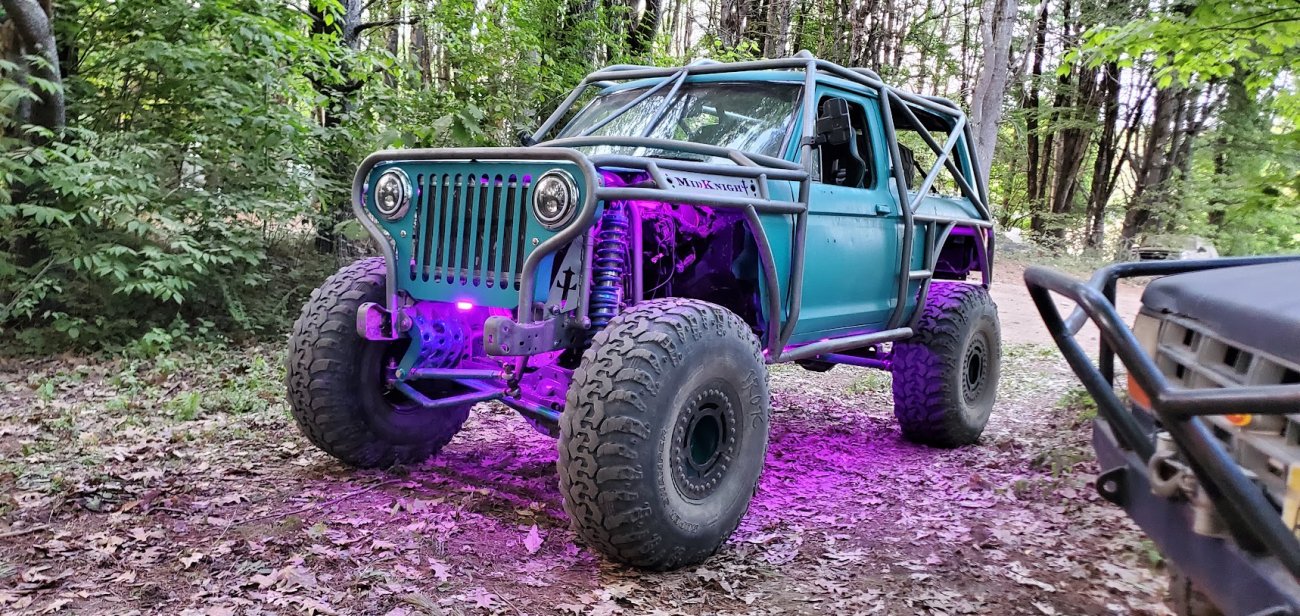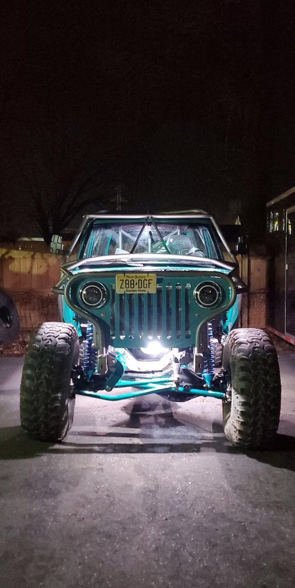 Here’s something you’ve probably never seen before. It looks like some kind of Willys coming towards you, but it’s a little confusing because you’re counting the grill slots, but there aren’t any turn signals under the headlights, or the holes to mount them in. Looking closer it appears to have a Ford TTB front suspension. Is that a Dana 44 TTB? Those look like 39-inch IROKS that you would find on a rock crawler. Why doesn’t this thing have a Dana 60 solid front axle?