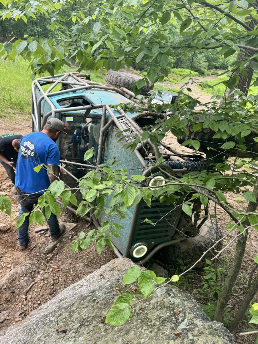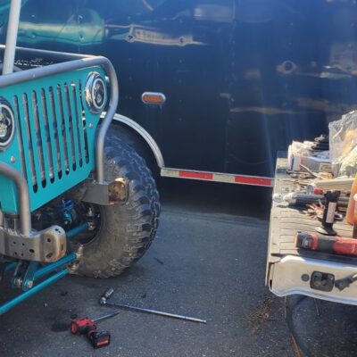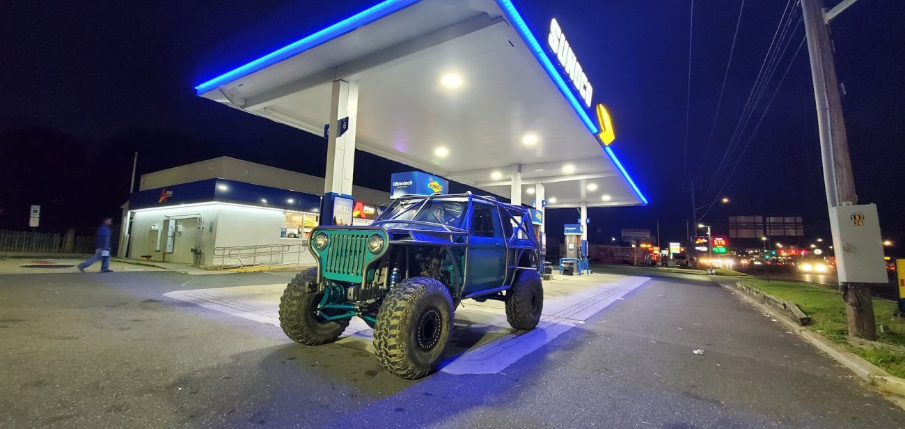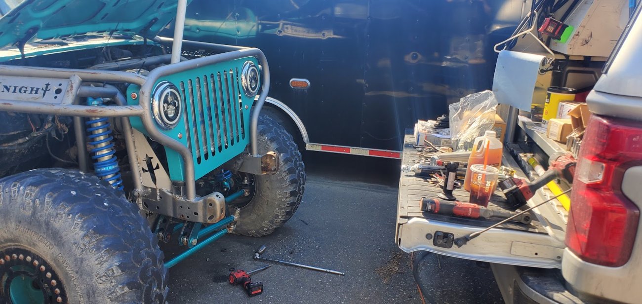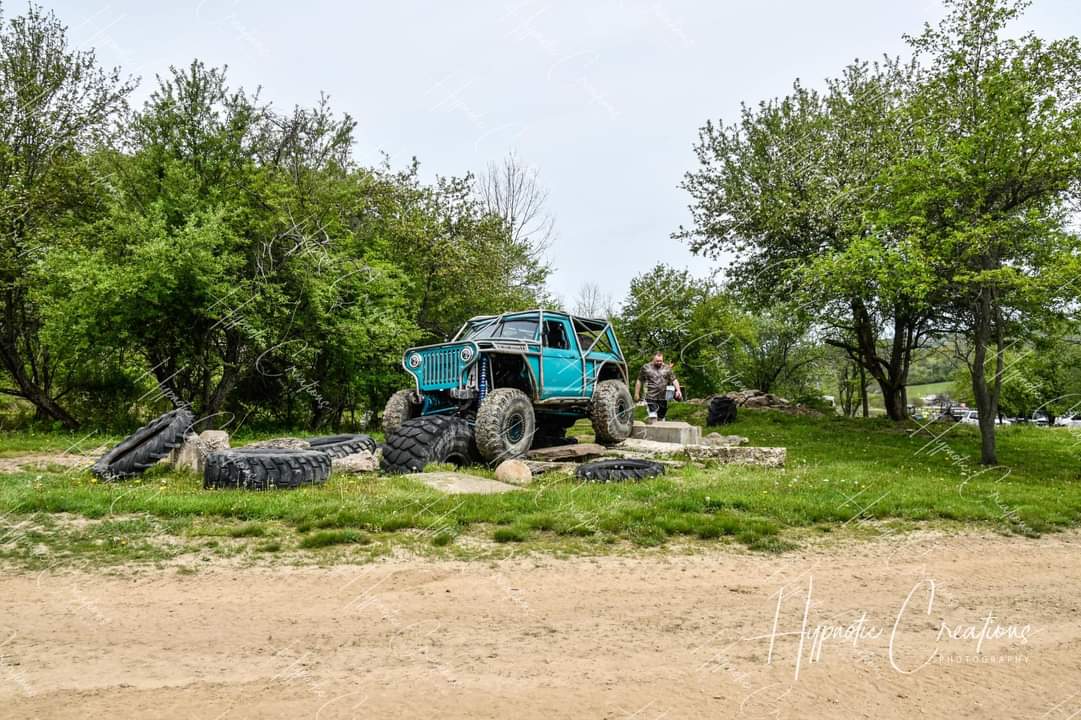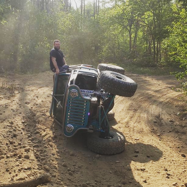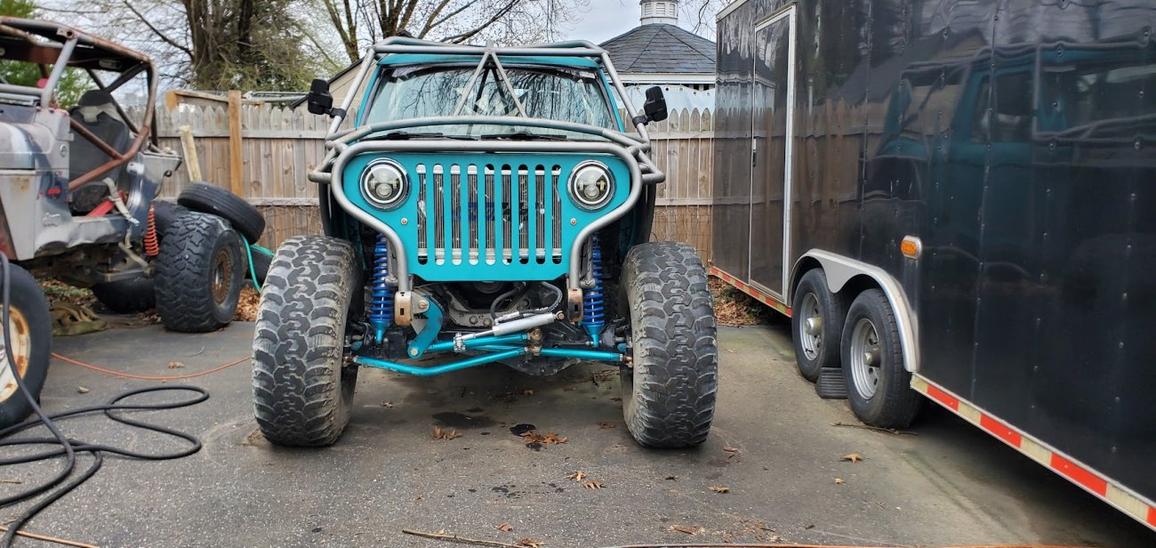 Here’s something you’ve probably never seen before. It looks like some kind of Willys coming towards you, but it’s a little confusing because you’re counting the grill slots, but there aren’t any turn signals under the headlights, or the holes to mount them in. Looking closer it appears to have a Ford TTB front suspension. Is that a Dana 44 TTB? Those look like 39-inch IROKS that you would find on a rock crawler. Why doesn’t this thing have a Dana 60 solid front axle?