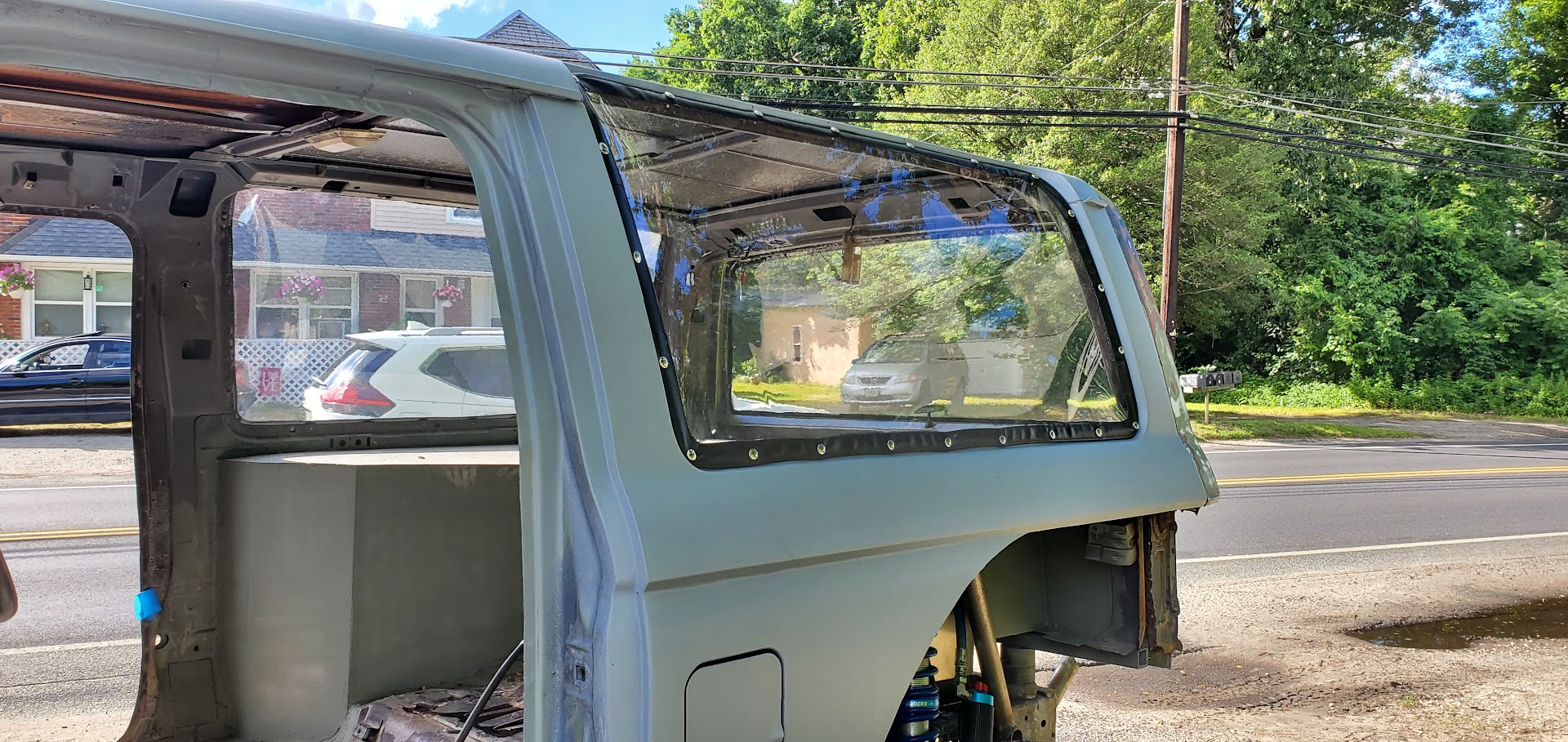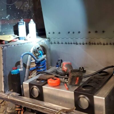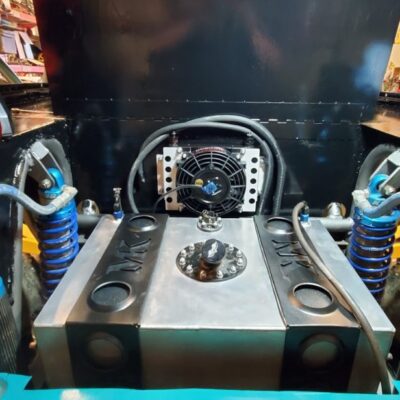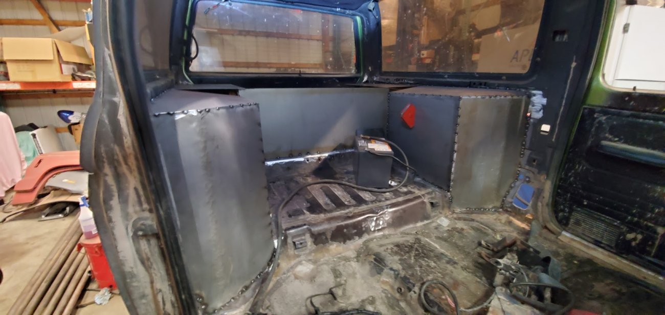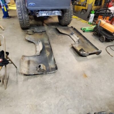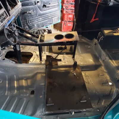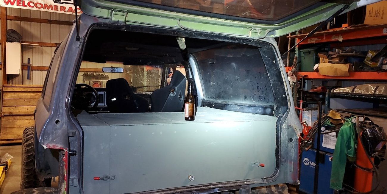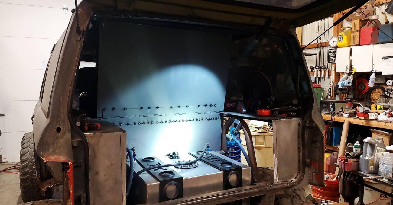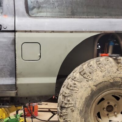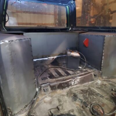 With the rear suspension being stretched 8-inches rearwards, an old Ford Ranger bed was used to make the panels to fill the wide space between the rear tires and the doors.