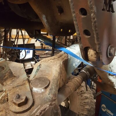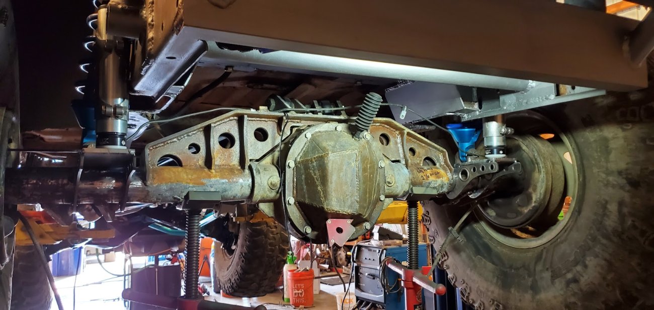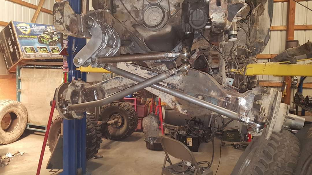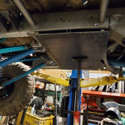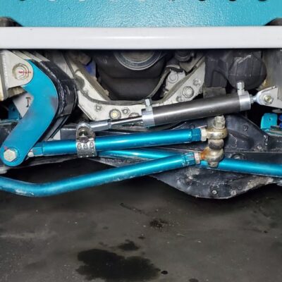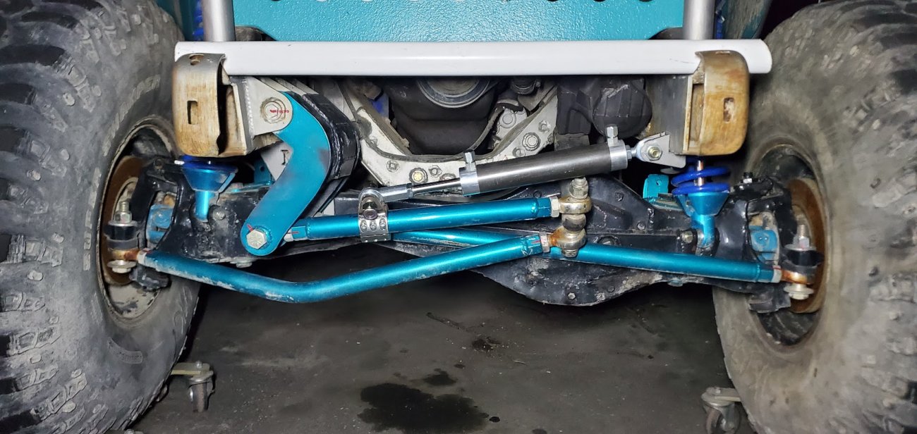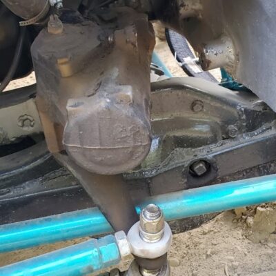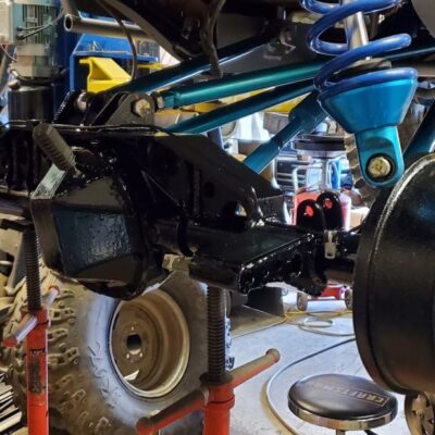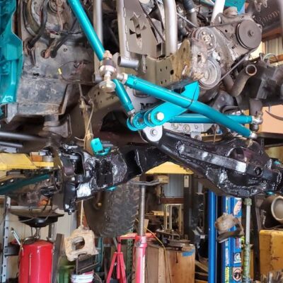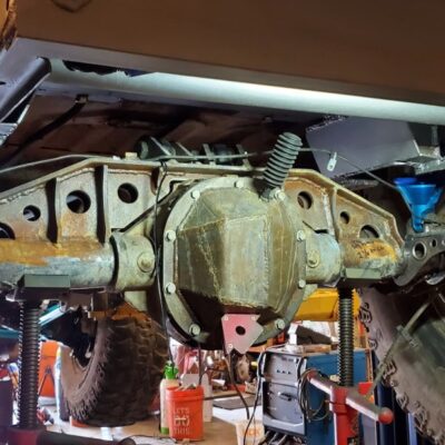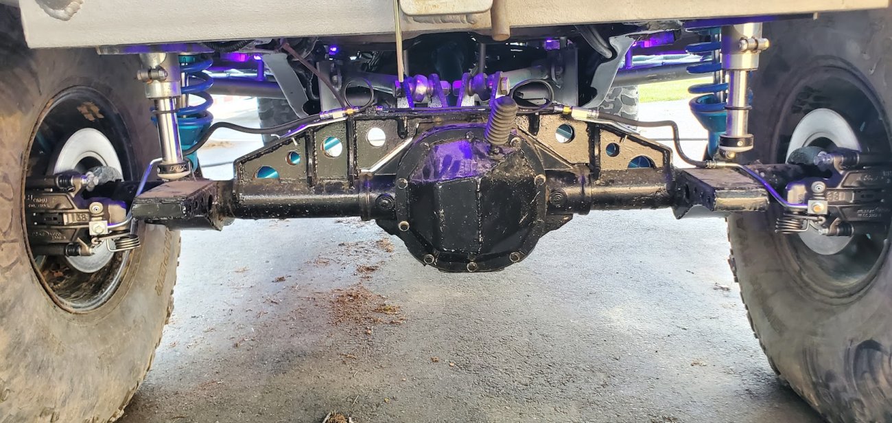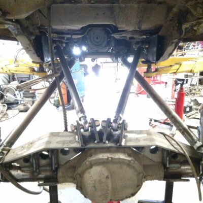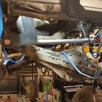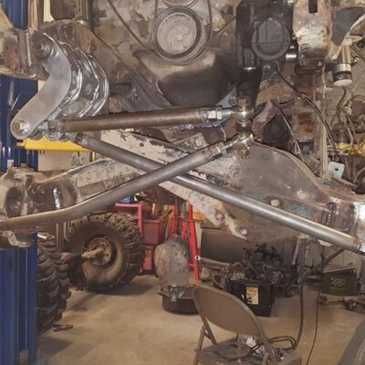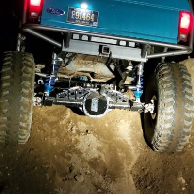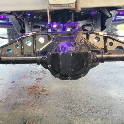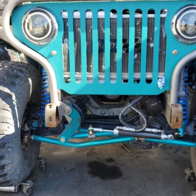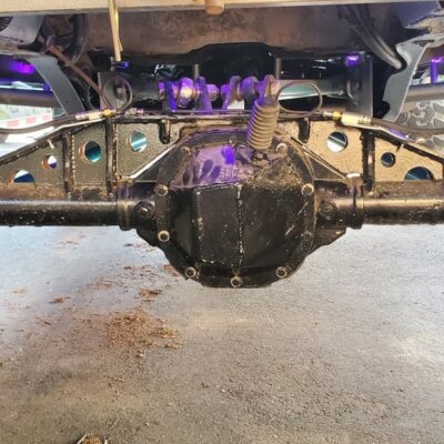Dana 35 TTB, Trussed, Clearanced for 20″ of travel but limit strapped at 15* camber max., 4.56 Gears, Lockrite Locker, Warn Jeep Hubs, Moog Joints, Stretched 6.5″ forward and each beam is stretched 0.5″ for an additional width of 1″ overall. Ball joints moved out