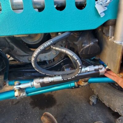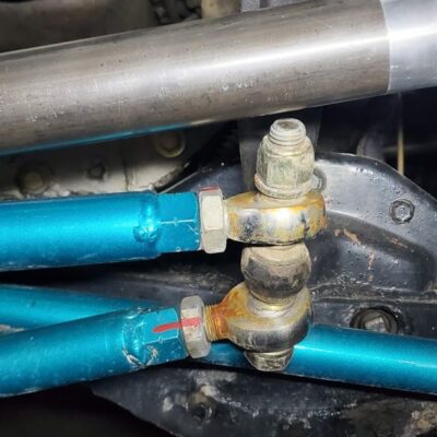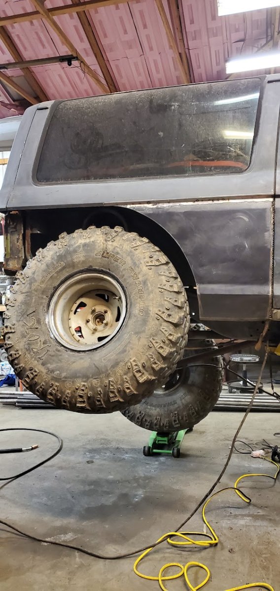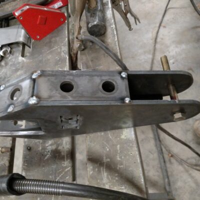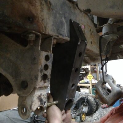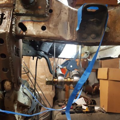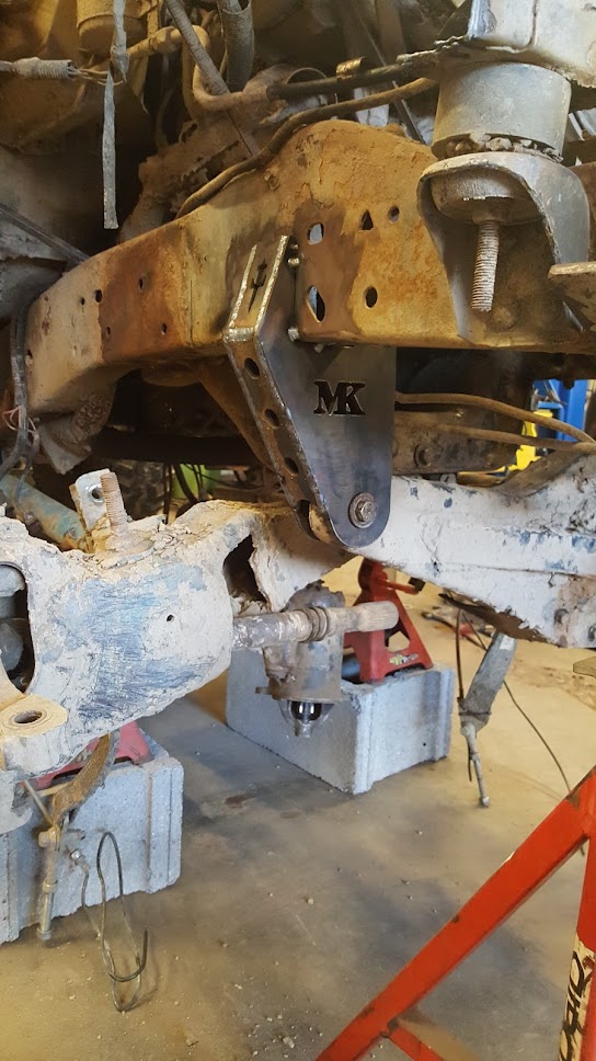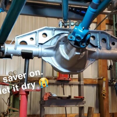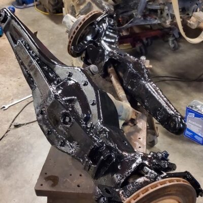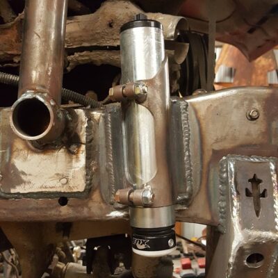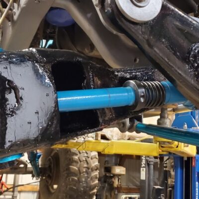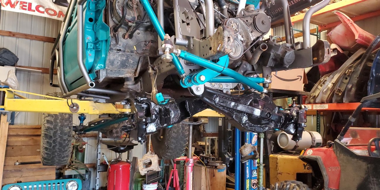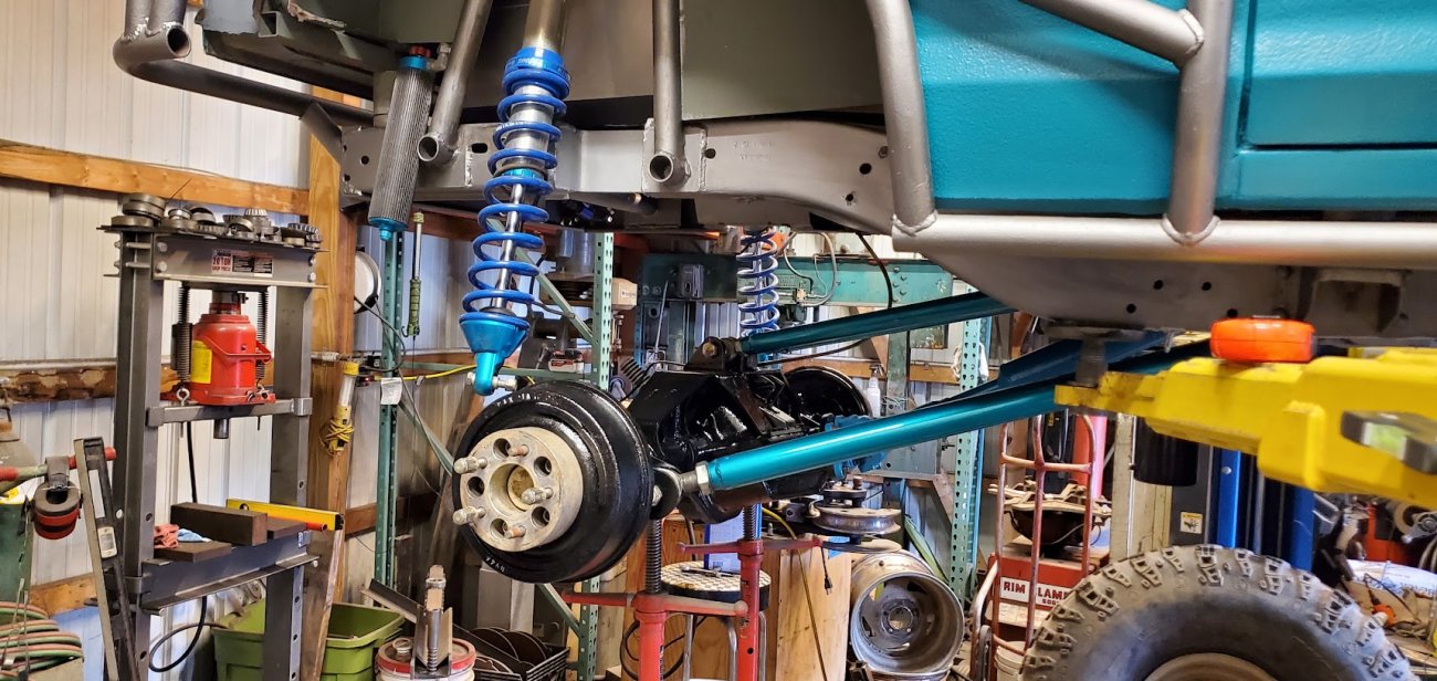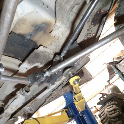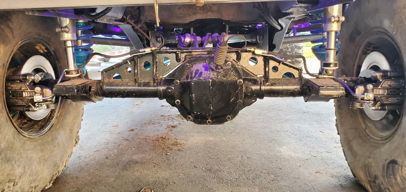 Dana 35 TTB, Trussed, Clearanced for 20″ of travel but limit strapped at 15* camber max., 4.56 Gears, Lockrite Locker, Warn Jeep Hubs, Moog Joints, Stretched 6.5″ forward and each beam is stretched 0.5″ for an additional width of 1″ overall. Ball joints moved out