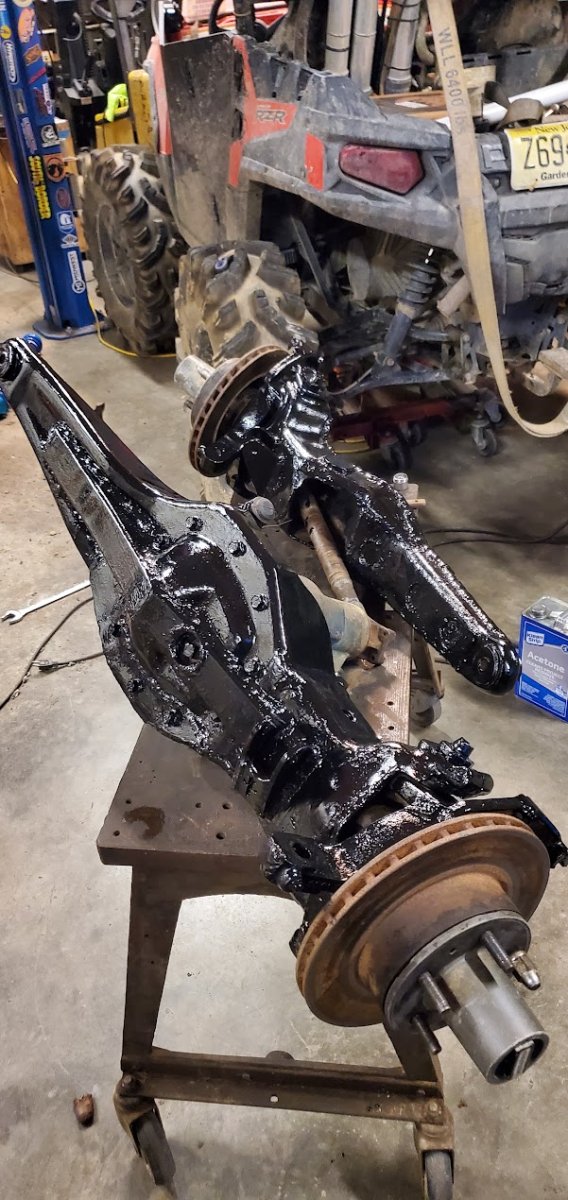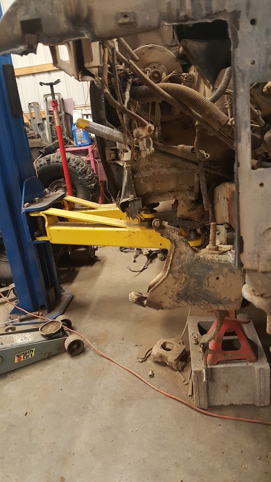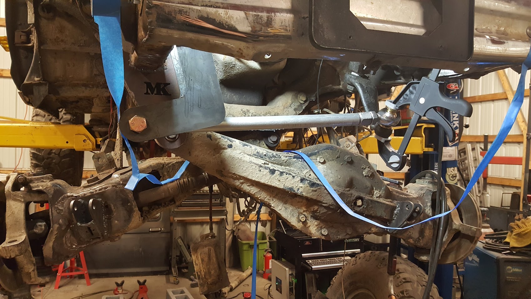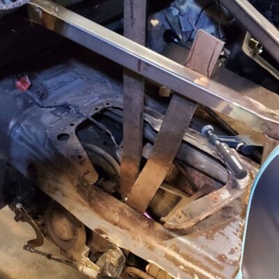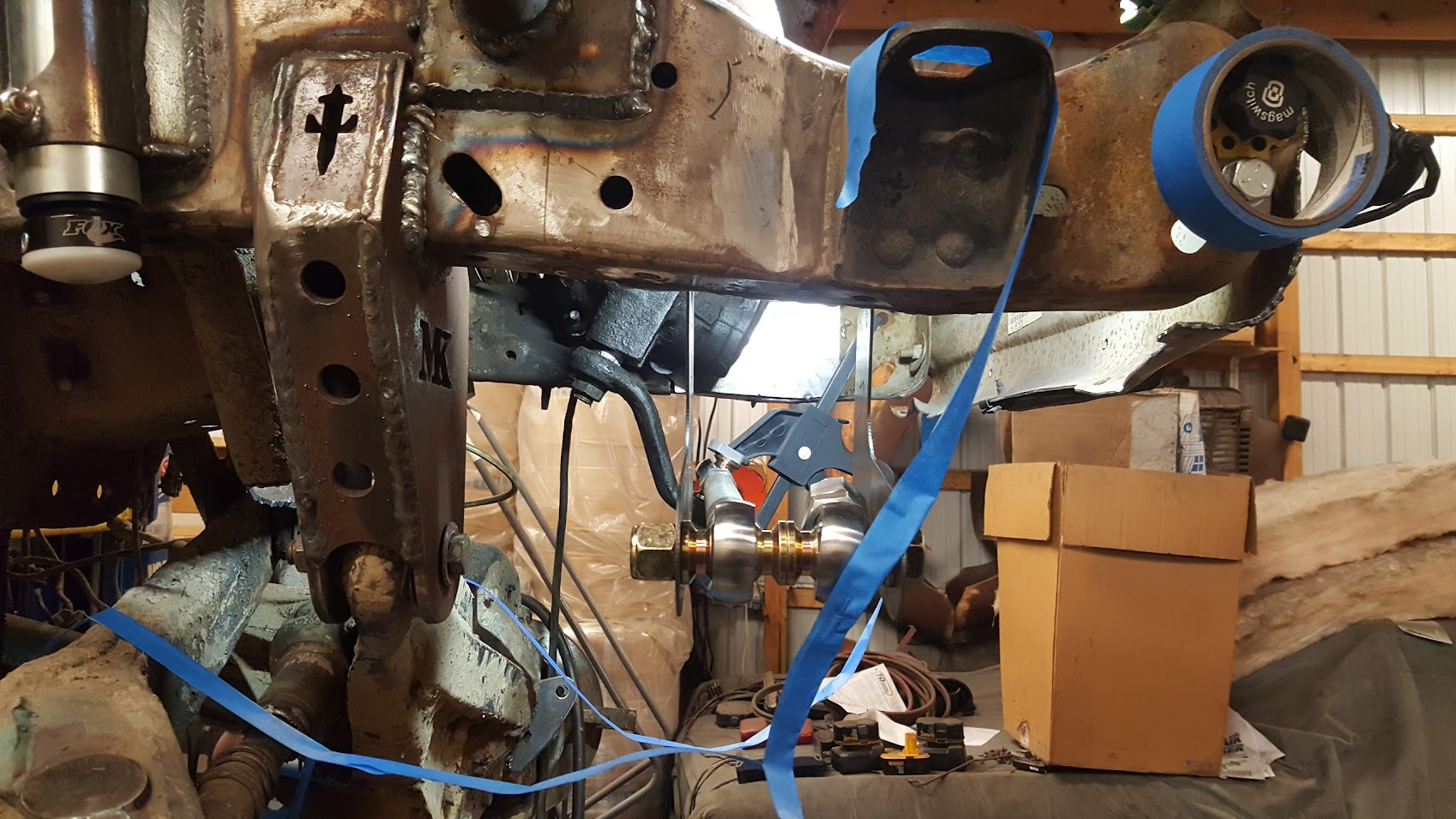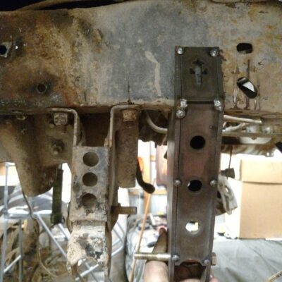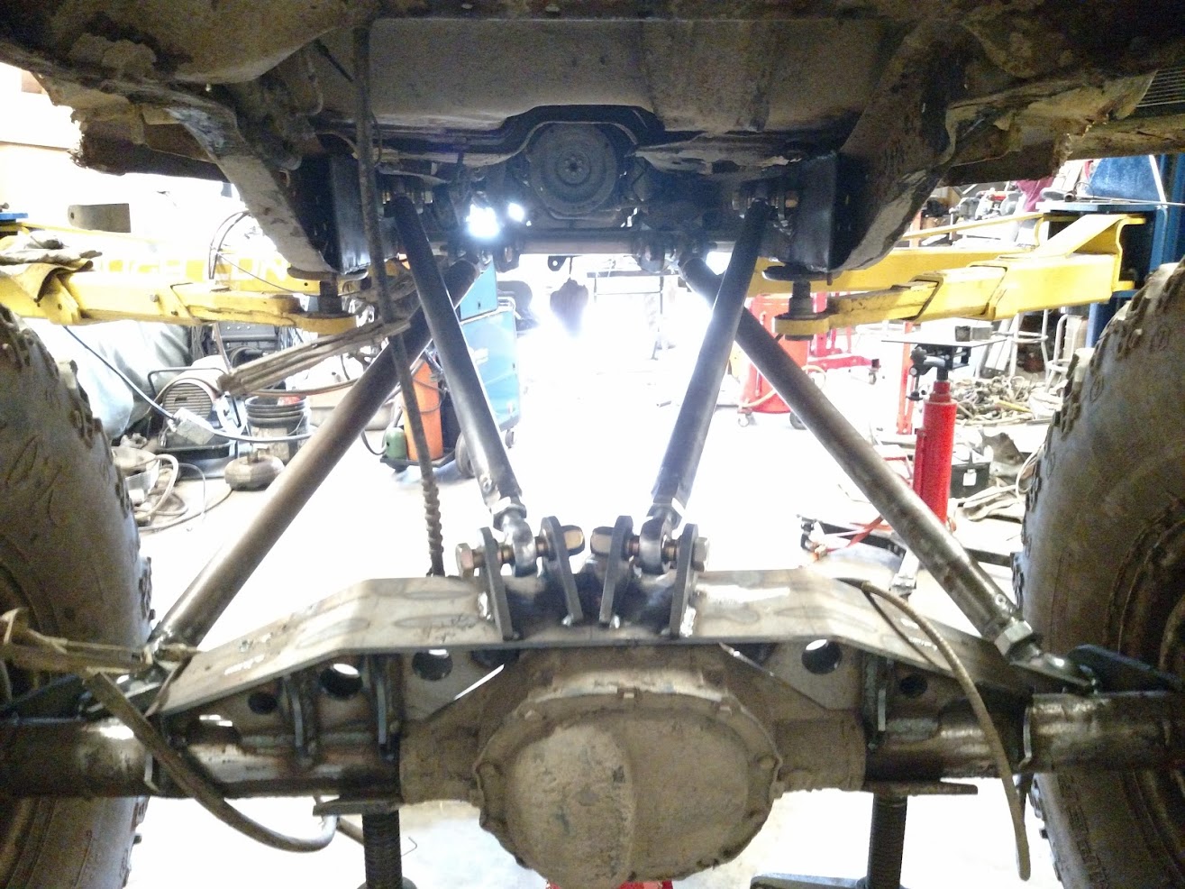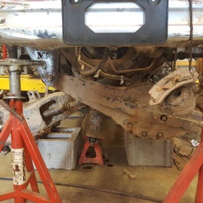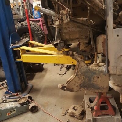 Dana 35 TTB, Trussed, Clearanced for 20″ of travel but limit strapped at 15* camber max., 4.56 Gears, Lockrite Locker, Warn Jeep Hubs, Moog Joints, Stretched 6.5″ forward and each beam is stretched 0.5″ for an additional width of 1″ overall. Ball joints moved out