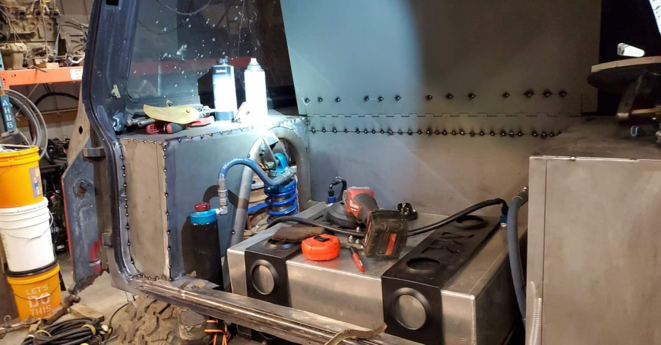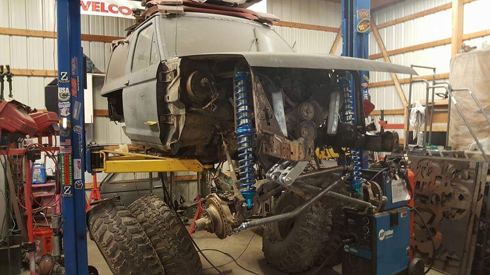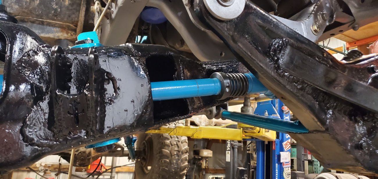 And the lower ball joint mounts were cut, moved outward a 1/2-inch, and welded in position to correct the alignment. The front axle is outfitted with 4.56 gears and a Lockrite locker. The front suspension uses longer radius arms, King 2.5-inch 14-inch coilovers, Fox bumpstops, and was pushed forward 6.5-inches. A drilled and tapped steering box, F350 power steering pump and hydro assist with a remote cooler help steer the 30-inch IROK tires.