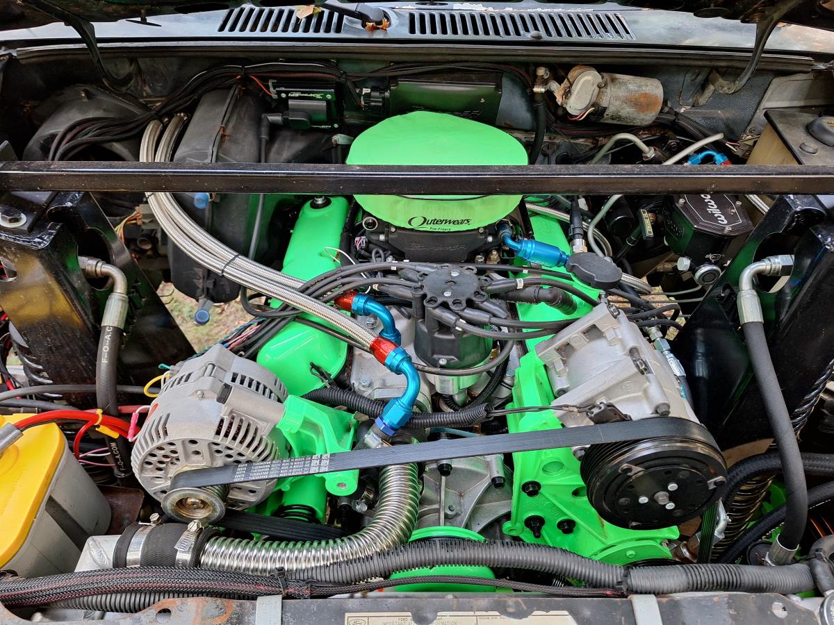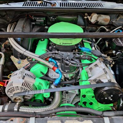 The Bronco II gets its power from a rebuilt, but stock Ford 302 topped with a Holley Sniper fuel injection. The 302 is backed by a Ford C6 automatic transmission which sends power to a Northwest Fab doubler with an NP205 transfer case. Yes, that’s an A/C compressor you see in the photo above. It gets hot in Texas and Rodney has retained the air conditioning in his Bronco II builds.