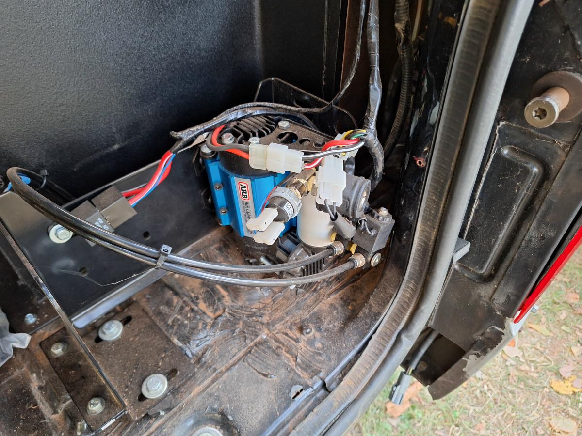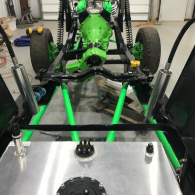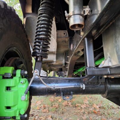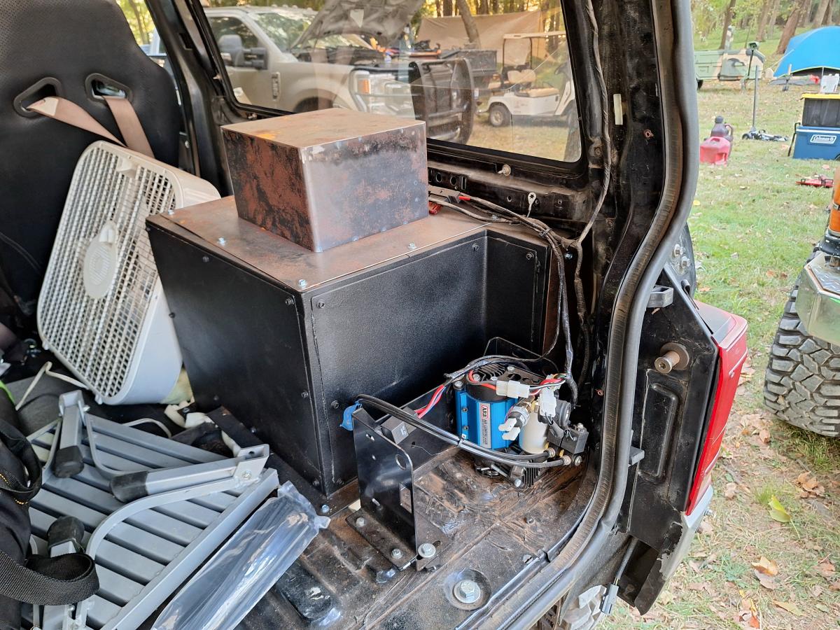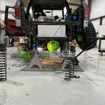 In the cab you’ll find the Holley Sniper display mounted where the instrument panel used to be along with switches for the ARB air lockers on the dash. The Northwest Fab triple shifters let you know that there’s some serious upgrades under that transmission tunnel. The rear coil towers have been boxed in and the ARB air compressor is mounted in the right rear corner of the interior.