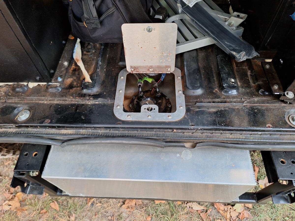 Since the quarter panels were cut to make room for the larger tires and the lengthened wheelbase, the fill neck for the new fuel cell was mounted in the floor just inside the rear hatch.