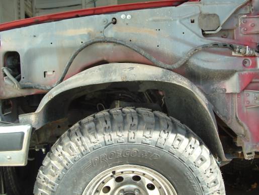 I cut about 1 inch up along the factory flare crease on the ’89 Bronco II. I taped the fender and marked it with a Sharpie before cutting. A plasma cutter works best, but a cutoff wheel or jig saw also works. After cutting, reinstall the fender and test tire clearance.