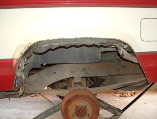 I decided to cut the rear to match the front. I used a Plasma Cutter and cut though the outside fender. Once I had my first cut, I used pliers to bend the fender down where it was cut to gain access to the inside of the wheel well. Once opened up I again used the Plasma Cutter to cut the wheel well using the outer cut as a guide.