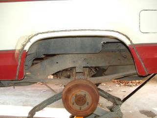I decided to cut the rear to match the front. I used a Plasma Cutter and cut though the outside fender. Once I had my first cut, I used pliers to bend the fender down where it was cut to gain access to the inside of the wheel well. Once opened up I again used the Plasma Cutter to cut the wheel well using the outer cut as a guide.